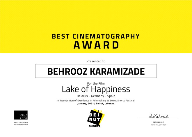 Recibimos el DIPLOMA que acredita a Behrooz Karamizade, Director de Fotografía de Lake of Happiness, como Premio a la Mejor Fotografía en el prestigioso Beirut Shorts Festival, Líbano.