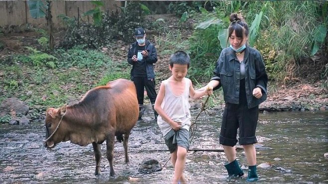 Grace was immediately fascinated by a scenery when she saw the little boy walking down the river with his cow joyfully.
