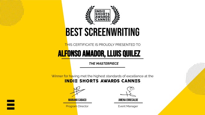 Thrilled to announce that the short film The Masterpiece, by Àlex Lora Cercos, won Best Screenwriting Award at Festival de Courts- Metrages Cannes Indie Shorts Awards.